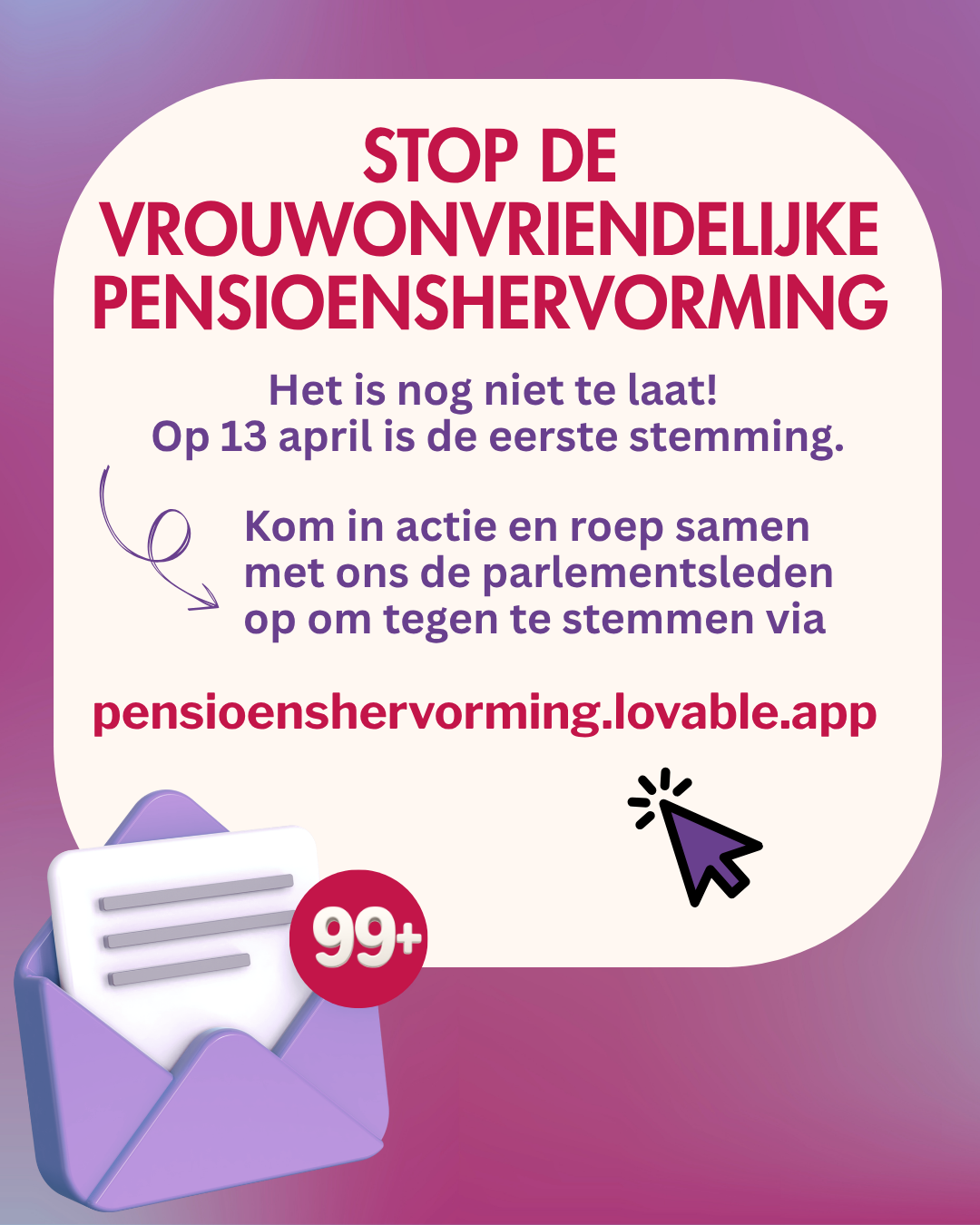 Het is nog niet te laat om de pensioenshervorming tegen te houden. Op 13 april is de eerste stemming. Roep mee de parlementsleden van de meerderheid op om tegen te stemmen.
